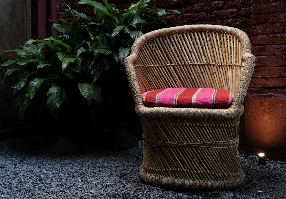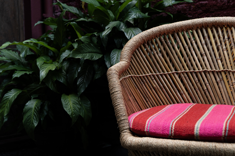 Poltrona em bambu e palha na cor natural com encosto trançado e assento com estofado em Aguayo